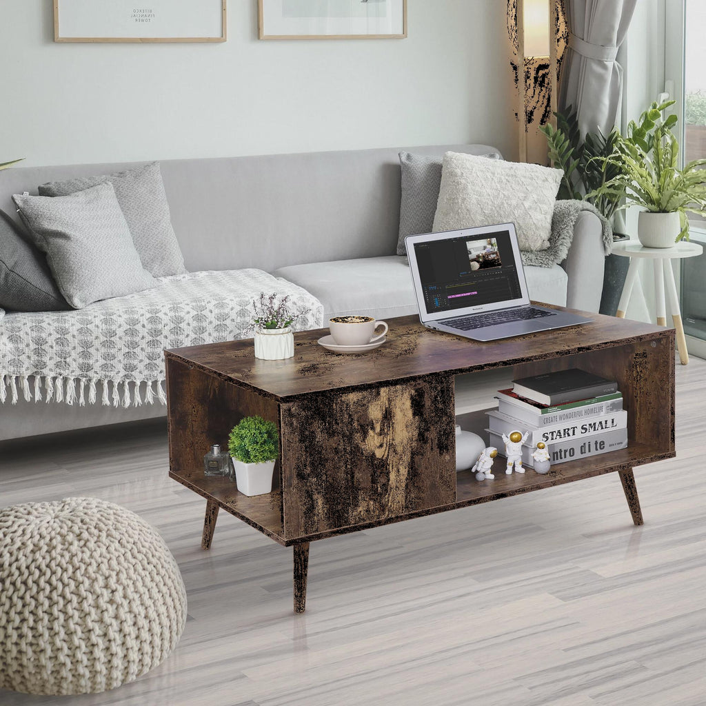Stable and Durable: With high-quality wood panels and angled solid wood legs, this mid-century modern coffee table provides stable support for your books and decorative pieces, and no wobbling or collapsing.More Storage Space: Place saves you from the clutter of the desktop and looking for things frequently used; Store TV boxes, remoter, routers, books, toys, video game machines, coffee, tea, and finger foods.Multi-Function One: Leisure, entertainment, social, or work, all your needs are satisfied. You can place a television on this wooden coffee table to binge-watch TV series or films; To make fun, play board games, and toys with your children and family; Enjoy afternoon tea with friends or do some simple work on the table is also recommended.Easy To Clean And Assembly: With a manual, and included assembly tools, this coffee table can be installed within 20 minutes. The table's smooth material and open interior allow for easy wiping to help maintain its clean look for years to come.