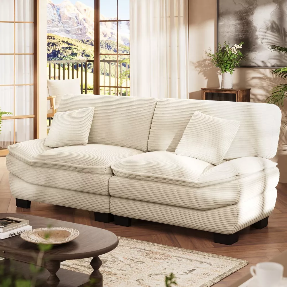 Beige 87" Corduroy Couch with 2 Pillows, Sailboat-Shape Deep Seat Sofa for Living Room, Small Space, Office, Apartment-Morden Fort