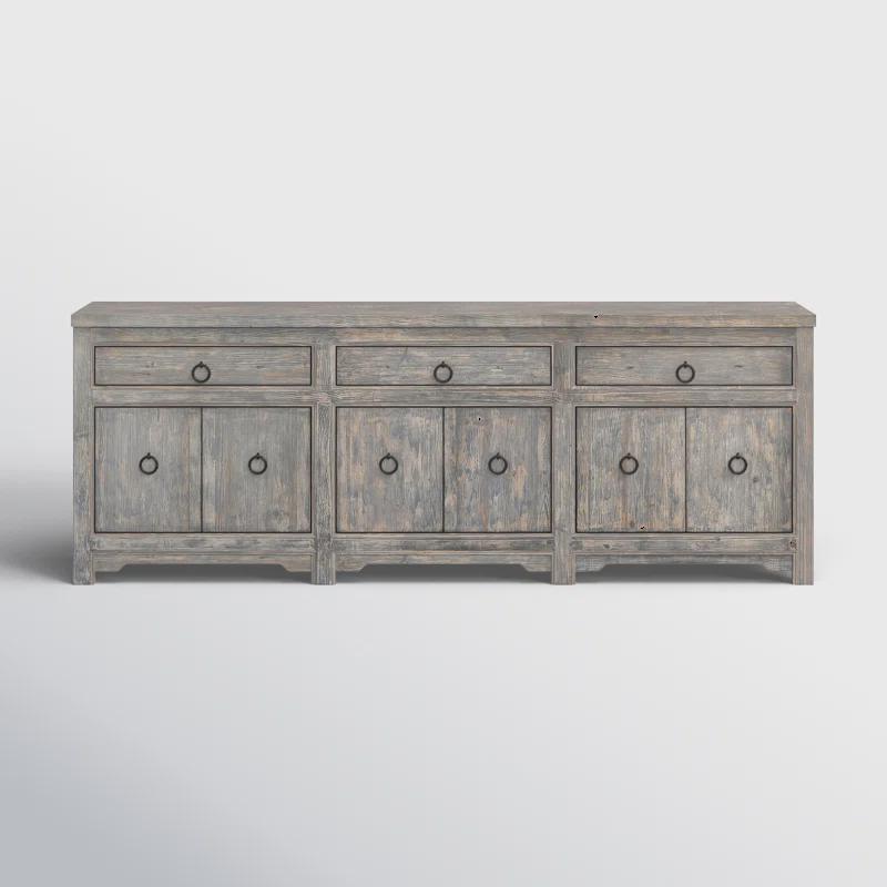 This versatile sideboard can double as a TV stand in your living room, making it a must-have in your home. It's made from solid pine wood in a weathered blue finish with visible wood grain for a breezy, boho look. Crown molding on the surface and round, black-finished ring pulls add plenty of visual interest to your space. The three double-door cabinets open to interior shelves that help you organize your board games, serveware, or entertainment consoles, while drawers are ideal for linens and cutlery. Plus, the cabinets have cable management cutouts for easy access to your wall outlets. This sideboard measures 104" wide, making it ideal for larger rooms.