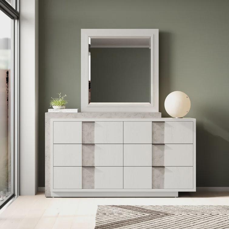 Elevate your contemporary home with the dresser and mirror. Crafted of rubberwood solids and white oak veneers, this kit features a wire brushed white finish with plinth style bases, full extension and fully stained interior drawers with premium felt lining in the top drawers, center floating style faux travertine inserts, and is accented with brushed satin nickel bar pull hardware. The dresser features six drawers, with cedar lining in the bottom drawers, and a statement-making travertine waterfall top that pairs well with the landscape mirror, which includes a 1 beveled edge, wrap-around touch LED lighting.