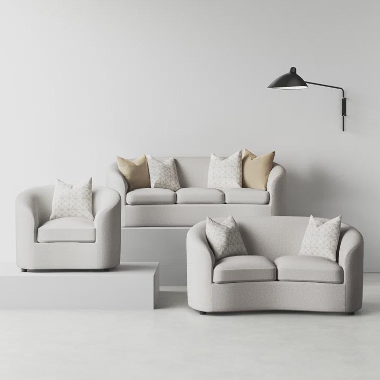 Create your modern entertaining area with this mid-century modern-inspired contemporary seating set, upholstered in a neutral latte finished fabric across its elegant and curvy silhouette. Curved and sloped armrests and plush cushions keep family and visitors comfortable all through the gathering. Coordinating boucle accent pillows with premium faux down fill provide extra comfort as discreet black legs offer a bit of elevation and definition over decorative rugs.