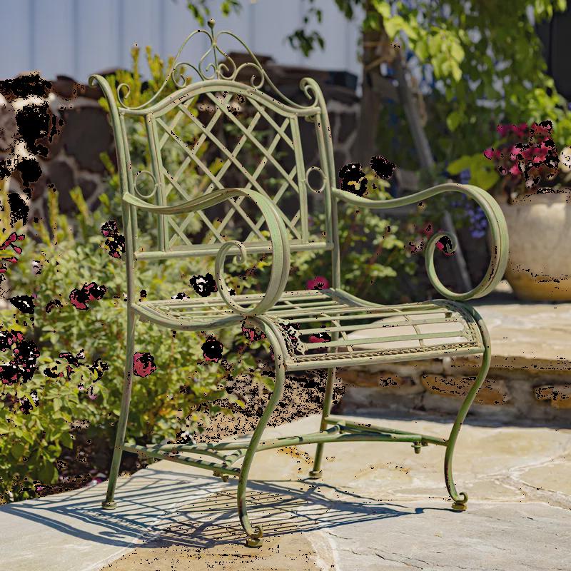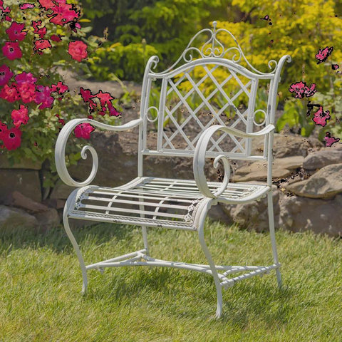Stephania Outdoor Metal Arm Chair with curved arms and seat. This superbly constructed Stephania Outdoor Metal Arm Chair features a stylish, distressed appearance, perfect for your lawn or patio. The iron-crafted design and hand painted finish adds that touch of elegance that every area calls for. With is latch-work design and curved armrest and seats, this Victorian inspired armchair is as beautiful as it is functional. Pair with the matching Stephania Outdoor Metal Garden Bench (YLTR1083) and/or the Stephania Outdoor Metal Folding Table (AGGR7286) for a beautifully coordinated set.