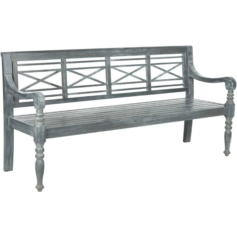 A classic garden bench inspired by the cross-hatched lattice pattern found in English cottages, the romantic Karoo bench is a welcome addition to porch or patio. Designed with beautiful proportions and artfully turned legs, this future heirloom is crafted of sustainable acacia wood in ash gray finish and silver galvanized hardware.