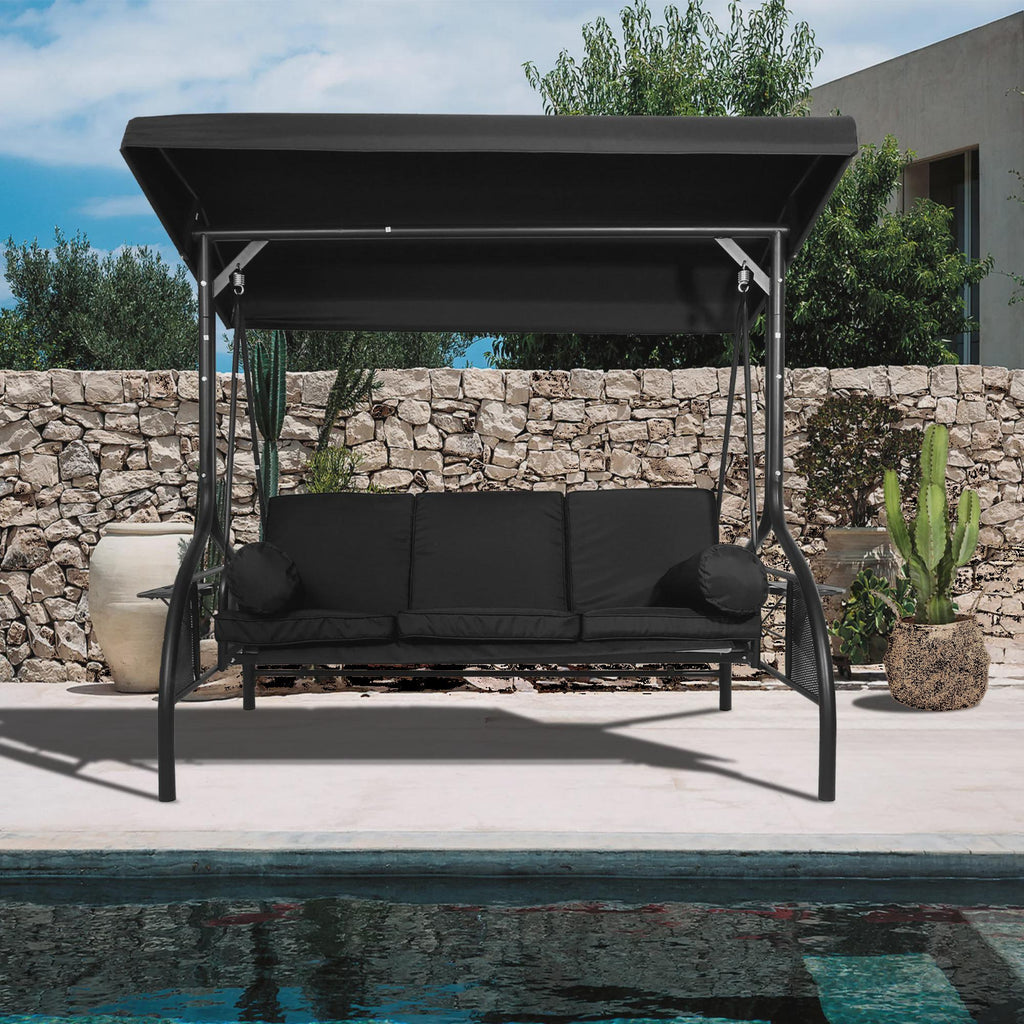 This 3-person outdoor patio swing can hold up to 661 pounds, it is made from thickened steel tubes to ensure stability and durability, the canopy is adjustable and is made of waterproof polyester fabric, which can protect you from UV rays and rain, the removable cushion is made of oxford fabric, the padding is made of sprayed cotton, which is soft and comfortable with a high resilience, and the side trays provide you with space to hold your belongings, the swing can be reclined or seated, and you can have a pleasant time with your family and friends on it.