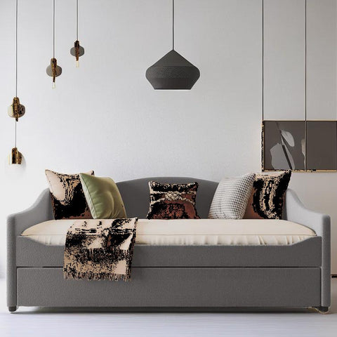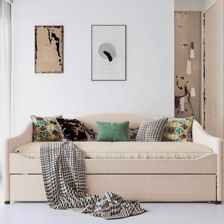 The wavy back and armrests of this upholstered daybed give a stylish and elegant feel. This modern silhouette not only adds to the bed's aesthetics but also provides additional support and comfort. Teddy fleece fabric is soft to the touch and has excellent wear resistance. There is a twin-size trundle bed at the bottom, which can be pulled out to provide a comfortable sleeping space when guests need to spend the night. Each side is equipped with LED light strips that provide soft and warm light, not only to create a comfortable environment for the user but also to be used as a night light. Sturdy slats provide even support for a comfortable sleep without the need for a box spring.
