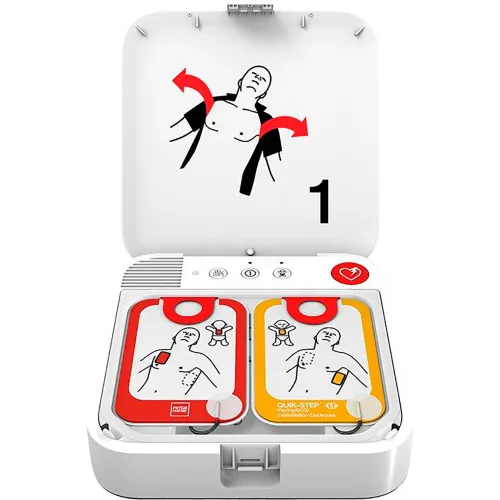 Simple design allows for easy operation by lifting the lid and following prompts. 4-year pad/battery life (while connected to device). Child mode to deliver appropriate shocks for younger victims with the push of a button (no separate pediatric pads needed).