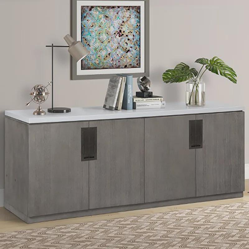 For the foyer, dining room, or office, the visual appeal of the pure modern credenza with quartz top is second to none. Its multifunctional design includes deep storage drawers and adjustable shelves behind each pair of self-closing doors. and elegant floating quartz top adds a mix of materials and versatility while a plinth base distinguishes this credenza's silhouette.