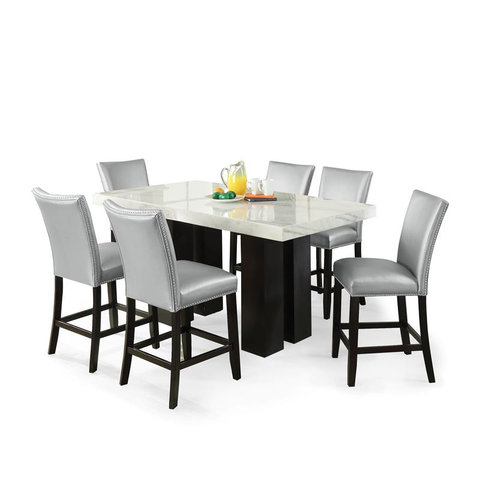 Elegant dining with a modern twist, the Camila Rectangle Counter Height 7 Piece Dining Set offers a beautiful white marble top with stylish wide legs finished in a deep espresso to add to contemporary design. The silver vinyl counter height chairs are accented by stylish silver nail head trim and feature stretchers for added strength and a comfortable footrest. Your purchase includes one rectangle counter height dining table and 6 silver vinyl counter height chairs.