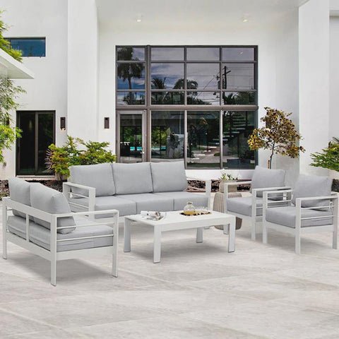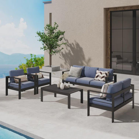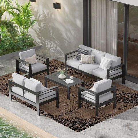 Gather your friends and family for a modern outdoor oasis with this 5-piece conversation set. Featuring a sofa, loveseat, two club chairs, and a table, it's the ideal spot for backyard barbecues or relaxing under the stars. The water- and UV-resistant cushions are made with Olefin upholstery and filled with foam for a comfortable seating experience. Plus, the machine-washable cushion covers make maintenance a breeze. Just remember to store them indoors or cover them when not in use to keep them looking fresh.