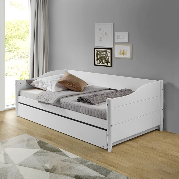 This classic daybed blends elegance and functionality to create a versatile piece for your living room, bedroom, or guest room. Crafted from solid pine wood, it features a curved head and footboard for a refined touch. The minimalistic design and rustic look complement the aesthetics of traditional French country. Plus, this daybed includes a pull-out trundle bed with wheels, making it ideal for accommodating overnight guests. With a weight capacity of 400 lbs. for the main bed and 250. lbs for the trundle, this daybed is a reliable choice for everyday use. Slats are included for added support, and no mattress is provided, allowing you to personalize your comfort.