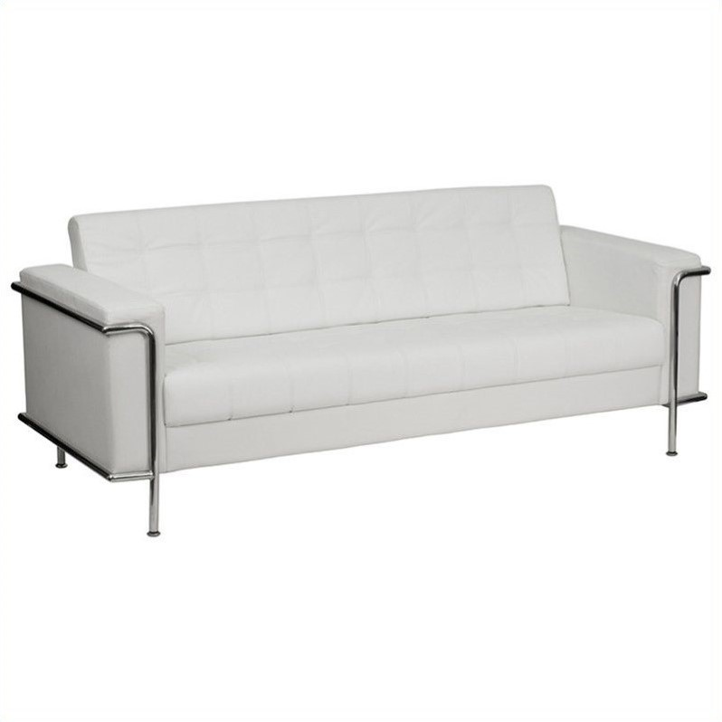 Your office reception space speaks to who your are as a company and this white LeatherSoft upholstered sofa with encasing frame makes quite a statement. This trendsetting piece features a straight arm design, and foam filled, tufted, fixed back and seat cushions for exceptional comfort. LeatherSoft is leather and polyurethane for added softness and durability. The integrated stainless steel frame and exposed accent bar not only add style, they are rust resistant and will keep up with the rigors of commercial use. Make a great impression on your clients, customers, and guests with this innovative contemporary sofa. This progressive style seating brings comfort and trend-setting style to your waiting room, reception area or home.
