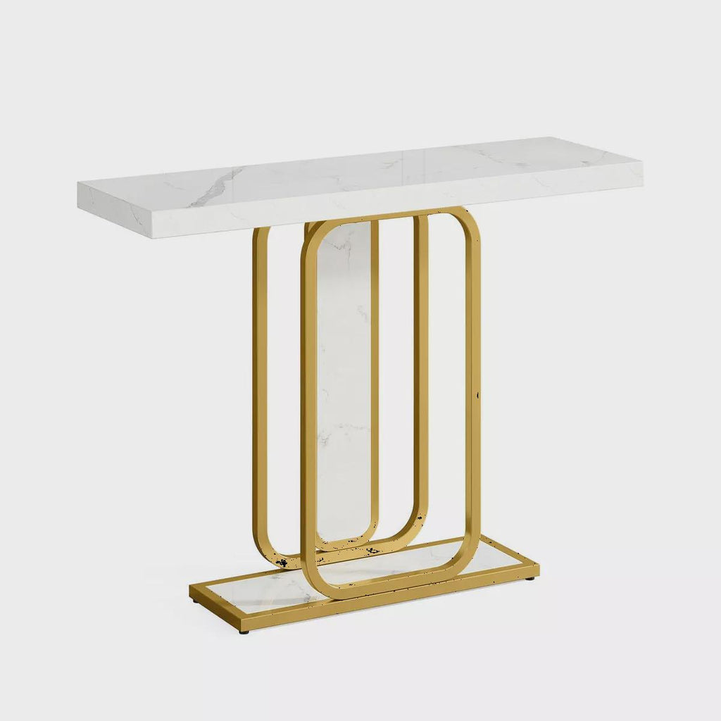Quality & Durability - The console table features a resplendent 1.77" thick particle board paired with a white faux marble veneer. Its durable metal frame and adjustable leg pads ensure both stability and longevity.