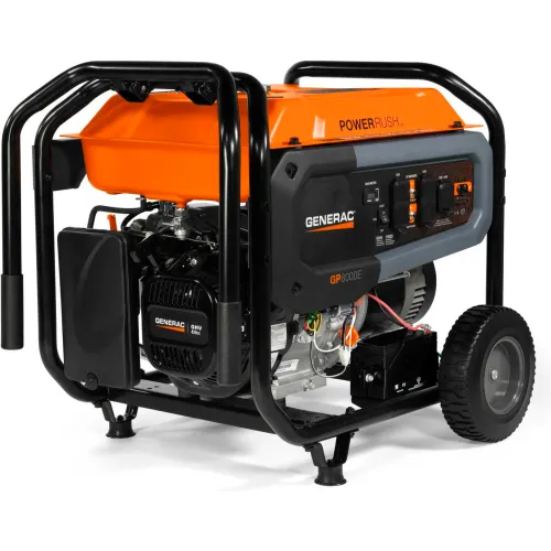 Generac™ GP8000E CARB offers many benefits that make this model a favorite for emergency power or recreational use. PowerRush™ Advanced Technology delivers over 30% more starting capacity* (*increase electrical current upon demand above rated output when starting electric motors), and electric start makes the GP8000E CARB easy to use (battery included). You'll always be prepared with the plug-in battery jack that keeps the battery charged and ready for unexpected outages. The long-lasting OHV engine and large-capacity steel fuel tank with fuel gauge provide increased durability and up to an 11-hour runtime at 50% load. Rough or rugged environments will not be an issue thanks to the covered outlets for added protection, heavy-duty wheels that will never go flat and a fold-down handle that will enable you to easily transport your generator to any location. The low-oil feature will automatically shut down the generator, preventing damage to the unit, while the hardened 1.25-in. steel-tube cradle increases strength and resilience. And with the regular maintenance alerts provided by your hour meter, you'll never be caught off guard.