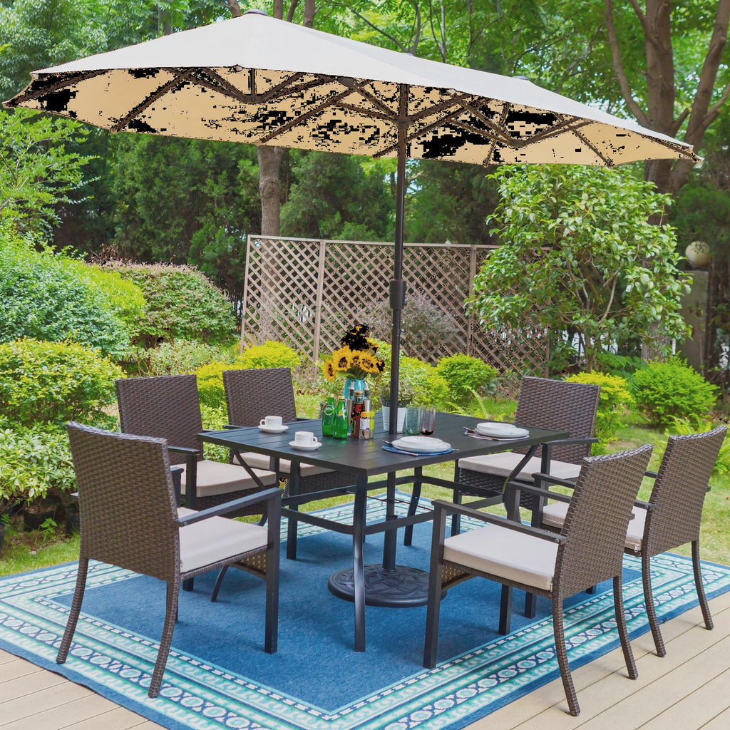 This stylish 8-piece MF Studio wicker dining set provides a beautiful aesthetic that is thoughtfully designed to thrive in warm temperatures. It includes one large rectangular dining table, one 13 ft umbrella and six wicker chairs. Made of high-quality steel frame with E-coating & powder coated finish and premium all-weather PE rattan, it offers supportive structure and stands up to outdoor elements for reliable long-lasting strength. The chair features clean lines, hand crafted wicker back & skirt, and cushioned seat that lends a warm inviting feel in your garden or yard. Insert the 13 ft double-sided patio umbrella onto the table top that offers an easy, fast and efficient shade solution, protecting your family/friends away from the harmful UV rays. The umbrella consists of 12 reinforced ribs and 1.5" diameter pole which has a strong frame and made of durable 180 G polyester fabric, providing with up to 99% UV protection & fade-proofing.