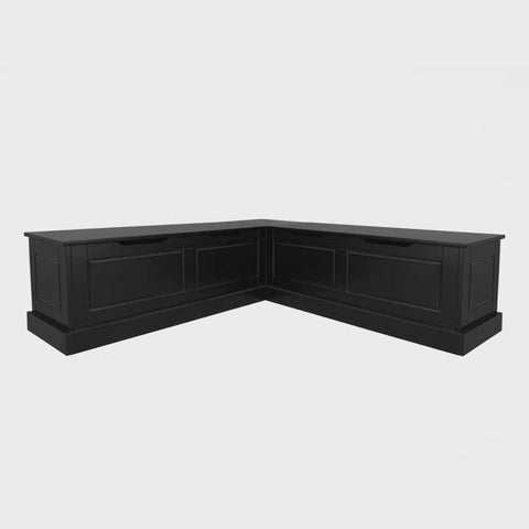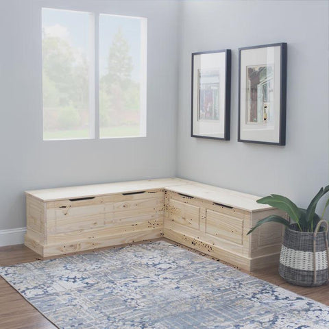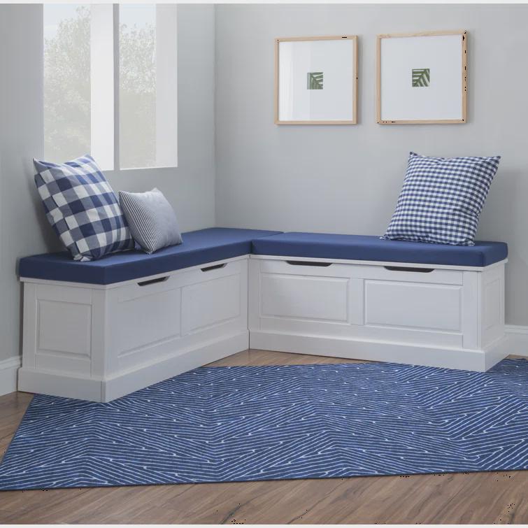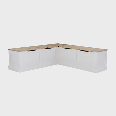 This breakfast nook creates the perfect place to relax with a cup of coffee or gather with friends over lunch. Cottage and farmhouse style will complement any round, rectangle or square table you would like to pair it with. Backless to provide ultimate flexibility with its surroundings, this solid white piece offers the look of built-ins without the cost or hassle. The solid pine seats open up to reveal hidden storage for extra placemats or seasonal decorations. Conveniently comes in one box. Matching table available. Cushions sold separately.