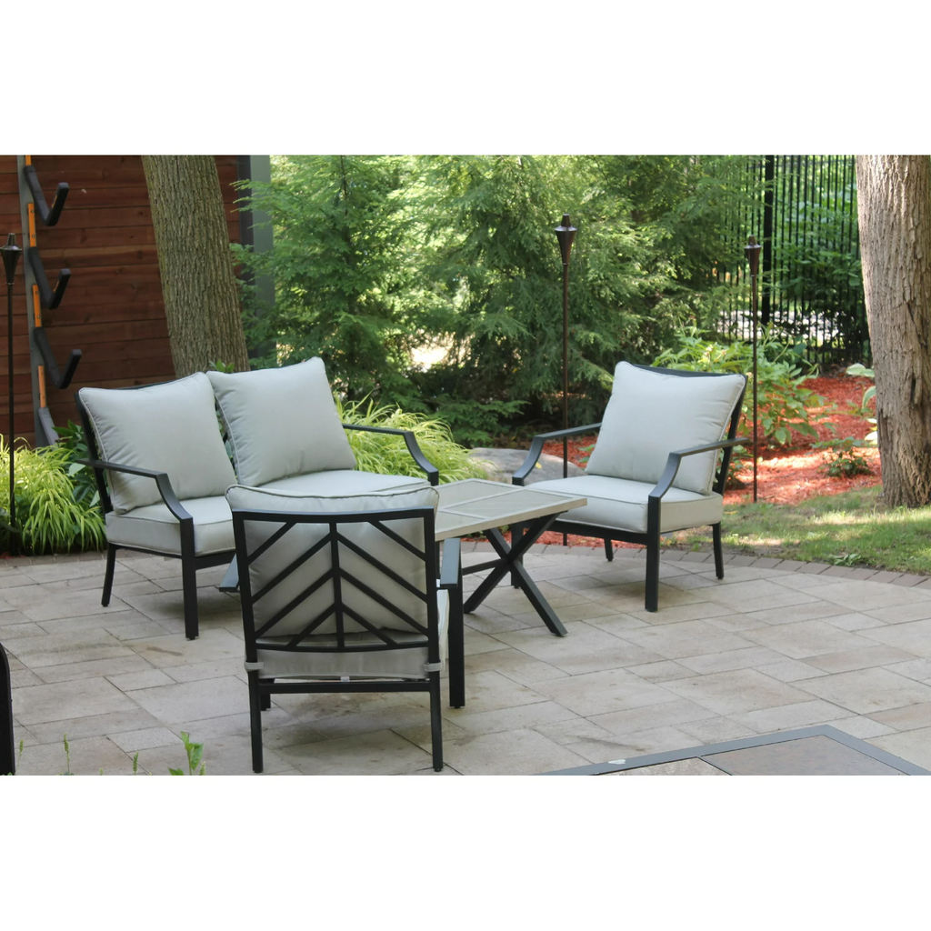 Create a unique look on your patio with the distinctive chevron-inspired openwork design and smooth, slatted surfaces with this 4 piece seating set. With two chairs, a loveseat and a coordinating low table, this metal set features an onyx grey coated frame with coordinating silver cushions. Add interest with the visual chevron story told on top of the x-frame coffee table. From balconies to patios and beyond, the Silver Spring set is the perfect way to style a gathering space you'll love.