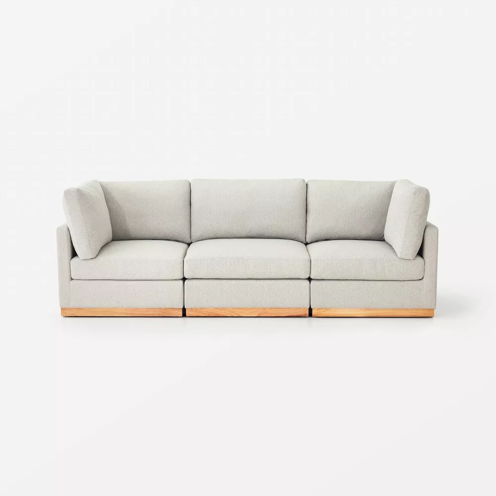 Update your lounge or living area with this 3-Piece Light Gray Woodland Hills Modular Sofa from Threshold™ designed with Studio McGee. This three-piece sofa sectional set makes a great addition to your indoor seating. Complete with a wooden frame, it features a streamlined design to lend a modern look to your decor. The cushioned seat and back offer unparalleled comfort and support, while the light gray fabric upholstery pairs easily with your existing decor. Plus, this modular sectional sofa set can be arranged in a multitude of ways to best fit your space.