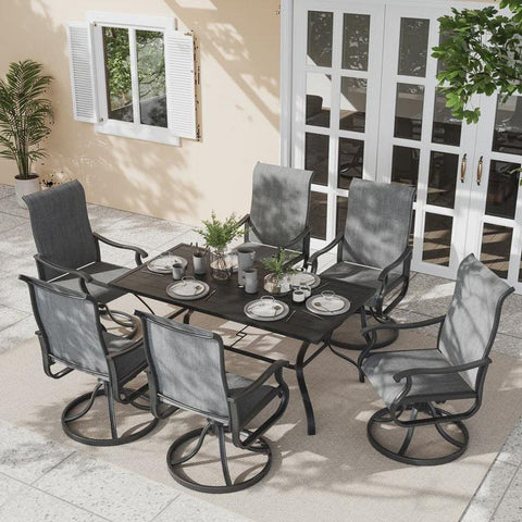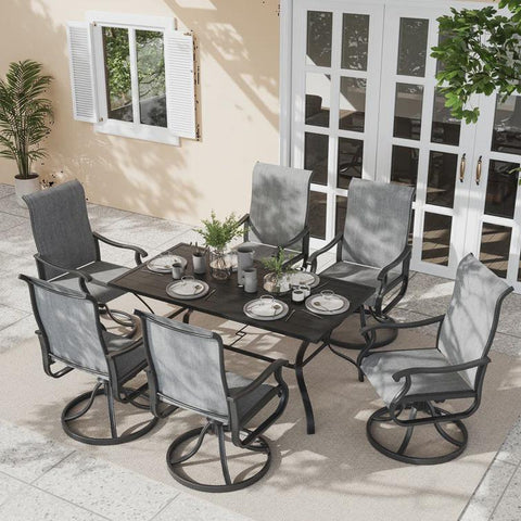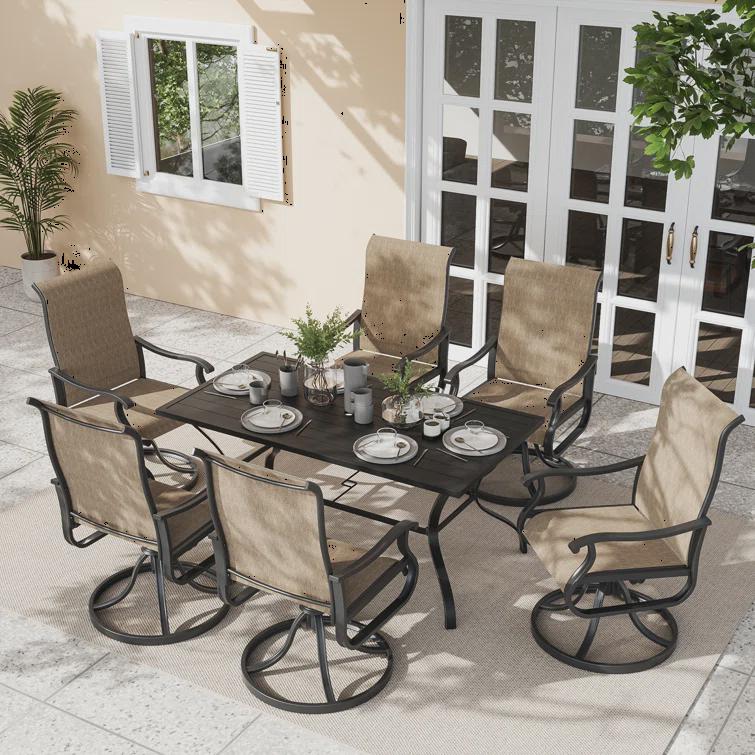 Elevate your outdoor dining experience with this luxury outdoor dining set. Each chair in this patio dining set features a 360-degree swivel and gentle rocking function, made with durable PVC-coated polyester fabric, and a weight capacity of 400 lbs, making it ideal for patios, gardens, and porches.