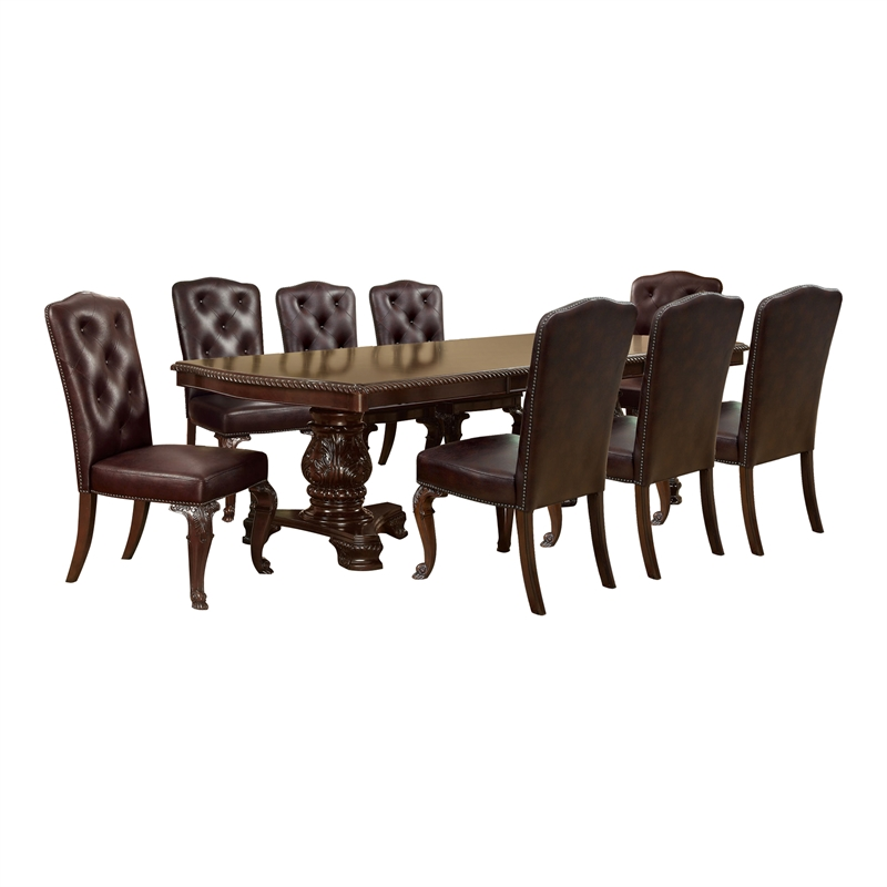 Guests will dine in delight with this nine-piece round wood dining set with two extendable leaves. Finished in a spectacular brown cherry, this set features eight dining chairs, with two that boast camelback style backrest and dramatic button tufting on black faux leather upholstery. Nail head trim adorns the frame of each chair as they're supported on cabriole style legs. The remaining chairs flaunt intricate molding details and cut outs on the backrests and matching leg styles. The rectangular wood dining table brings its own level of elegance, crafted with molding details around the tabletop and a dual pedestal base.