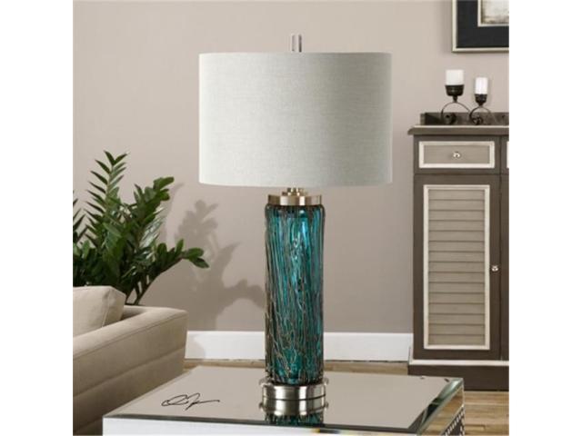 Blue Glass with bronze sugar spun accents and brushed nickel plated details. The round hardback drum shade is a light beige linen fabric.