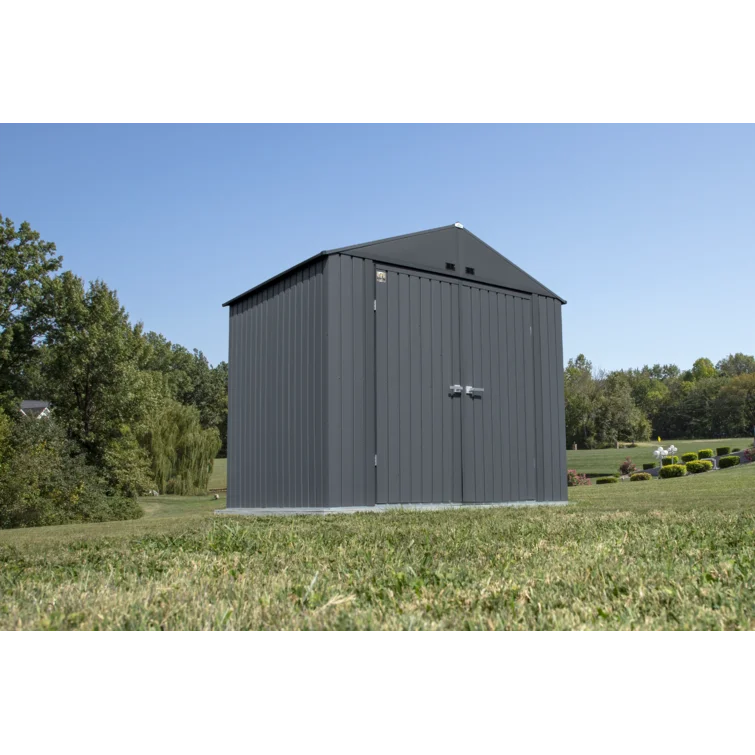 The steel shed is an innovative premium storage solution with revolutionary new features. It has an attractive squared wall design and textured wrinkle paint in an anthracite finish, making it a welcome fixture in any backyard, garden or outdoor setting. Made from galvalume, us steel with aluminum and zinc plating which is highly anti-corrosive, this steel shed is built to last! The shed also features a tall 72 in. Wall height and high gable roof for added headroom, plus extra walk around space. The rigid reinforced swing open doors with brushed nickel key lock handle allow for easy access to the interior while allowing storage against the front wall. In addition, gable vents provide increased airflow to the shed’s interior. All hardware is included for assembly.