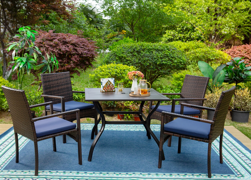 MF Studio 5-Piece Outdoor Patio Dining Set with Metal Square Dining Table and 4 Rattan Chairs for Outdoor, Yard, Porch. Enjoy a happy time with your friend or family around the outdoor dining set, it is a great and happy time. Sharing drinks, stories, interesting things, and playing games away from working. MF Studio 5 PCS patio conversation set may be your best choice. The wicker rattan chair is made of premium PE rattan, tightly woven under the seat, which is due to all-weather & fades resistance. The chair legs use high-quality metal tube legs, which are strong and durable. The soft sponge cushions are detachable and wiped lightly with a wet wipe for easy care and maintenance.