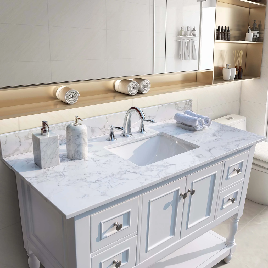 43‘’x22" bathroom stone vanity top engineered stone carrara white marble color with rectangle undermount ceramic sink and faucet hole with back splash
