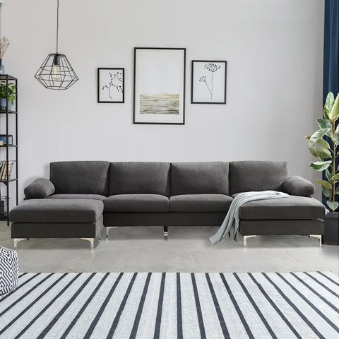 Family room/living room sectional sofa with an extra-wide double chaise lounge for maximum comfort and space. Ultra-soft and durable fabric upholstery, loose back pillows for a plush look and comfort. Sits up to 6 people comfortably. Available in various fun and vibrant style to best fit your home decor.