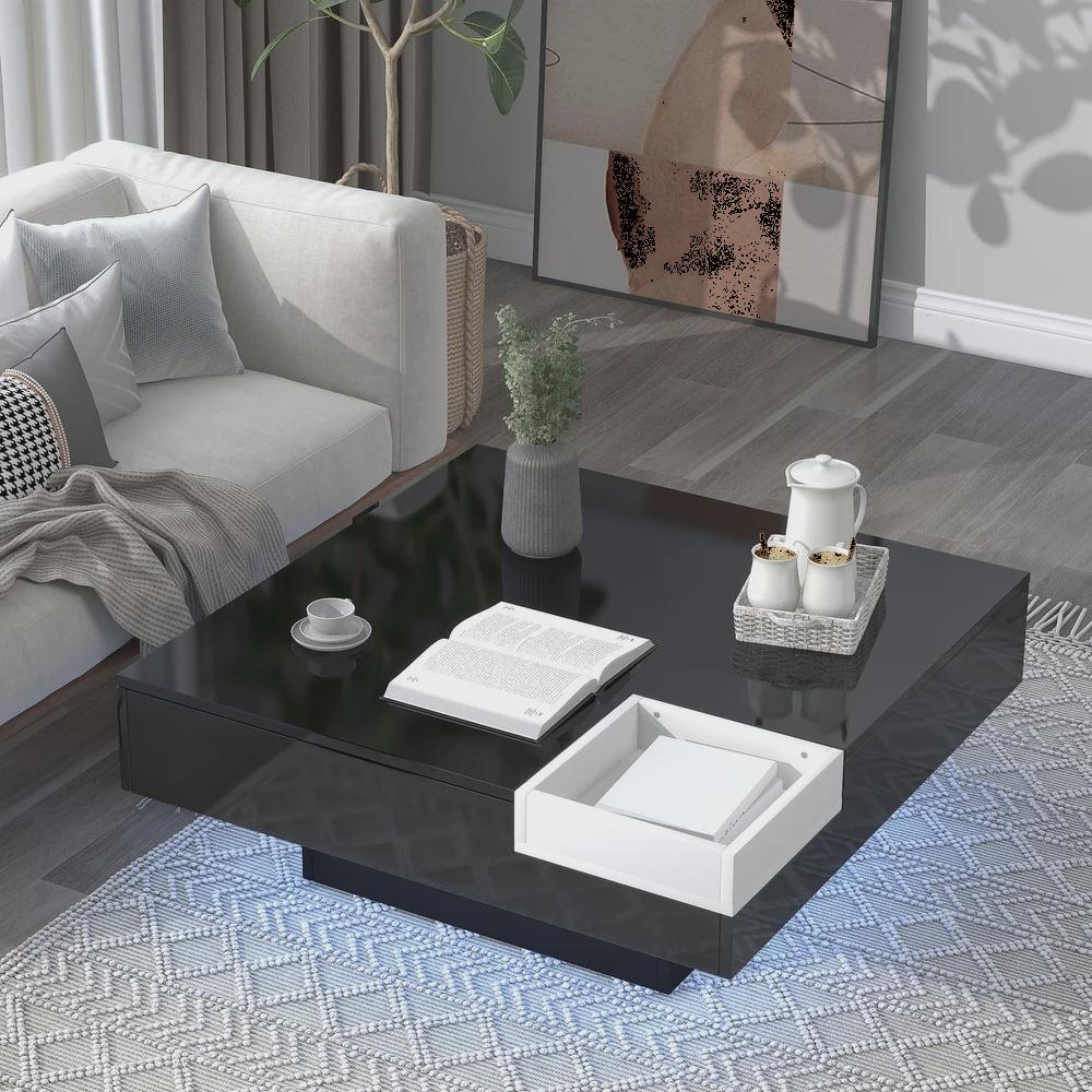 Black and white is never out of date, because that’s how artistic the color combination is. The designer of this coffee table understood this point so well and combined black and white to create this amazing functional furniture. And the contrast color tray design is an attractive point as well. The tray is detachable allow users it as their own needs. The square appearance conveys tranquility, stability and security, that’s offer positive impression to audience. It is a interesting and lighting coffee table due to the 16-color LED strip lights. It will offer some help to make many romantic or magical nights for users. The remote control for LED strip lights allow users change the different lighting modes effortlessly.