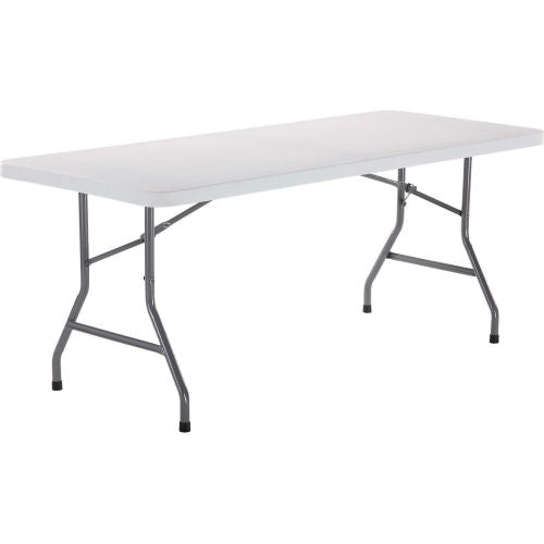 the Plastic Folding Tables are ideal for lunchrooms, training, security stops and more. Sturdy enough for permanent use, lightweight enough for temporary needs, this durably made table's legs fold up in seconds for a compact overall storing thickness of only 1-3/4". Ample work surface is moisture-proof and corrosion and stain resistant polyethylene. Reinforced heavy-gauge 1-1/8" steel tube frame and legs for superior stability and strength. Legs lock in both the open and closed position for reliable safety. White top with gray frame. BIFMA tested. Supports evenly distributed weight up to 1,000 lbs.