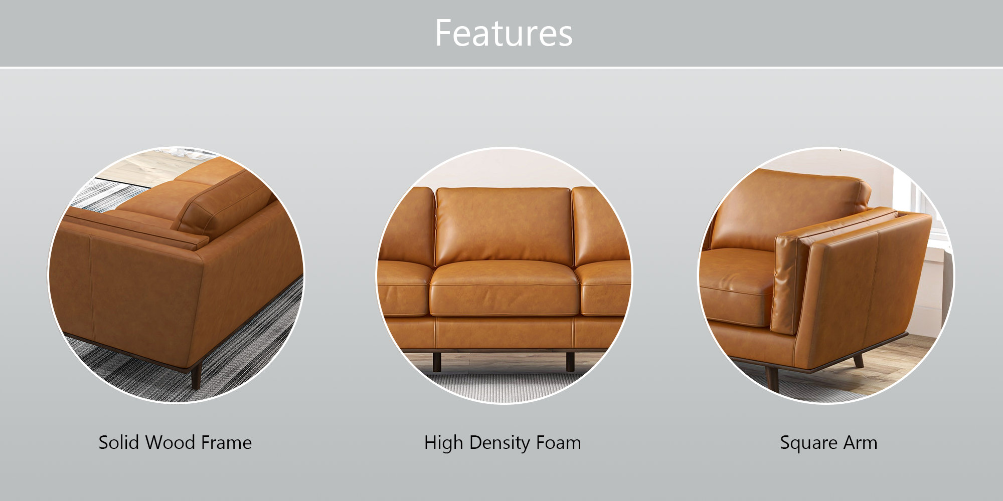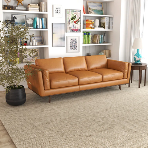 Mid-century modern style with the genuine tan leather sofa. Available in a variety of timeless colors, you're sure to find something that matches your decor.