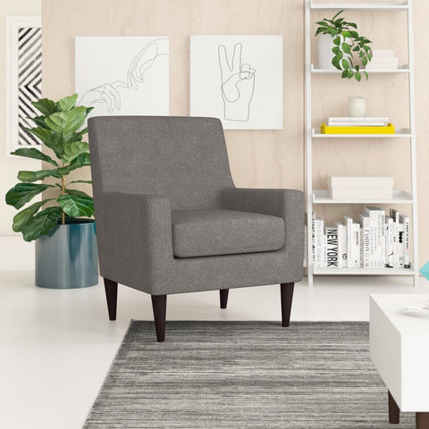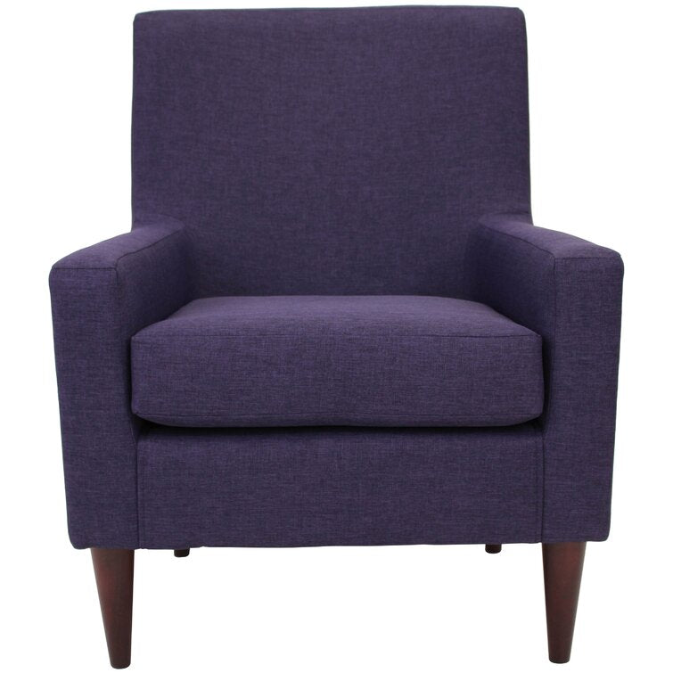 A traditional design gets a contemporary update in this streamlined armchair. Founded on a solid and manufactured wood frame, this armchair features a full back, track arms, and round tapered legs. Enveloped in polyester-blend upholstery, this armchair showcases detail stitching for a tailored touch, while coil springs and foam-filled cushioning provides comfort and support. Made in the USA, this armchair measures 34.5" H x 28" W x 30" D overall with a 250 lbs. weight capacity and a 17.5" seat height