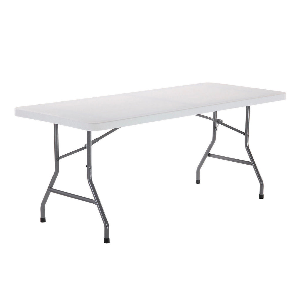 Plastic Folding Tables are ideal for lunchrooms, training, security stops and more. Sturdy enough for permanent use, lightweight enough for temporary needs, this durably made table's legs fold up in seconds for a compact overall storing thickness of only 1-3/4". Ample work surface is moisture-proof and corrosion and stain resistant polyethylene. Reinforced heavy-gauge 1-1/8" steel tube frame and legs for superior stability and strength. Legs lock in both the open and closed position for reliable safety. White top with gray frame.