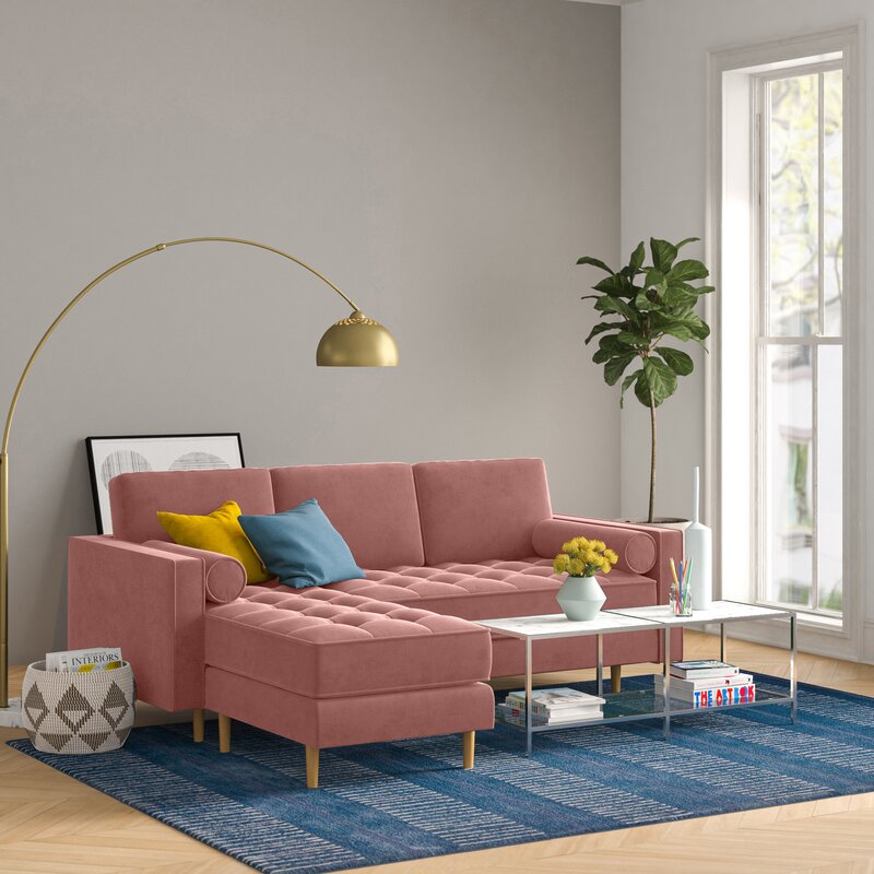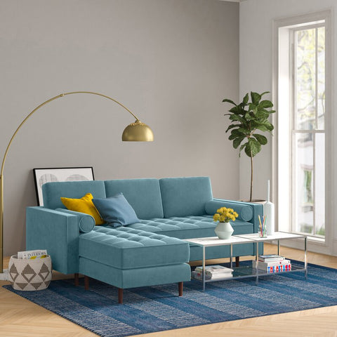 Incorporating classic lines with a streamlined silhouette, this reversible sectional sofa is the perfect combination of traditional design with a mid-century modern flair. Luxurious velvet upholstery provides an elegant look. A single seat cushion with a modern block-style tufting and two comfortably designed back cushions are perfectly complemented by two round bolster pillows. The tapered walnut stained conical legs provide ample support while adding style and sophistication. An interchangeable single seat cushion can be moved from one side to the other along with the ottoman allowing you to stretch out on either side of the sofa. Its versatility is amazing. No longer do you have to choose. No longer do you have to pick aside. No longer are you tied down? Plus, this product is backed by a one-year warranty.
