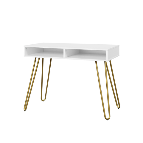 Mid-century style meets modern design. Four accents the clean lines of the open compartment desk and creates an attractive minimalist look. Large storage cubbies and a spacious work surface make this a great project workstation. The open compartment shelves are great for storing office accessories, supplies, writing utensils or other items you wish to keep handy and out of sight. A large open work surface has a multi-purpose design, for doing homework, laptop usage, and other home office activities. Simple, clean style pairs well with a variety of decor and office chairs for you to create the aesthetic you want in your room. With multiple color options available, you can choose the right color combination to fit your look. This desk is made that is built to withstand years of wear and tear. Whether it's for an open-home office or a small apartment, the desk is the perfect fit for any room.