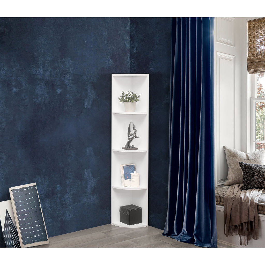 Orion 4 Tier Storage Shelves Corner Bookcase, White Wood, Contemporary. This Orion Corner Bookcase will help you stash your favorite collectibles without compromising your valuable space by offering plenty of storage for your favorite novels while taking up as little space as possible. The distinctive color will help you with your storage and decorate your home with class.