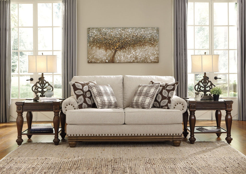 True classic character comes to life in the Harleson loveseat. Set back pleated rolled arms and warm brown exposed frame with bun feet are beautifully traditional. Lovely detailing carries itself through the herringbone weave in the soft upholstery. Seat cushions reverse to maintain durable comfort. Vintage-inspired jumbo nailhead trim graces the design. Plaid and botanical pillows in dark brown are a timeless touch