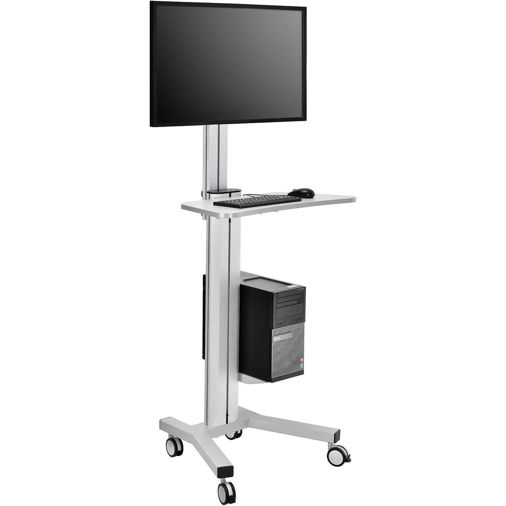 This Mobile Height Adjustable Desktop Computer Workstation with 4-Outlet Power Strip is perfect for office or medical urgent care environments. The workstation comes with a VESA 75/100 mount which can adjust for tilt, pan, as well as mounting height. The 27"W x 14-1/4"D worksurface is sturdy and height-adjustable as well. The extruded aluminum post is strong and corrosion-resistant, and come with 4 integrated switched power outlets and a CPU holder. The post can host a variety of optional accessories including printer stand and storage pocket. Easy to maneuver with four 3" swivel casters (two with brakes). Easy assembly.
