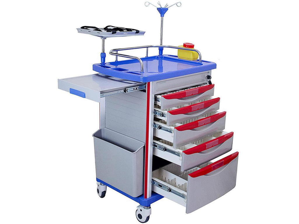 ACCESSORIES INCLUDED: (5) Smooth-Gliding Drawers, (30) Dividers for Arbitrary Partitioning, (1) Defibrillator Holder, (1) Slide Out Tray, (1) Large Storage Bin, (1) Height-Adjustable IV Pole, (2) Trash Bins, (1) Medical Sundry with Lid, (1) CPR Board, (1) Power Strip with 3 Outlets, (1) Oxygen Tank Holder, and (4) Anti-Static castors with two locks.