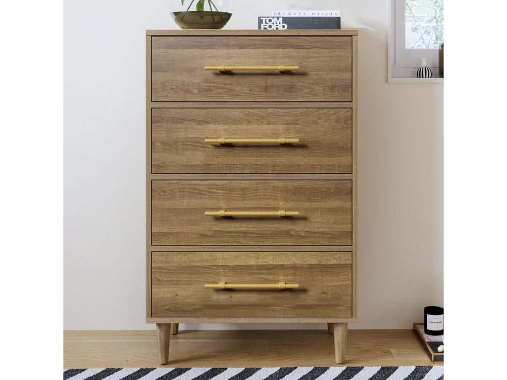 Mid-Century Modern Chest with Golden Handles, Four-Drawer, Natural Walnut