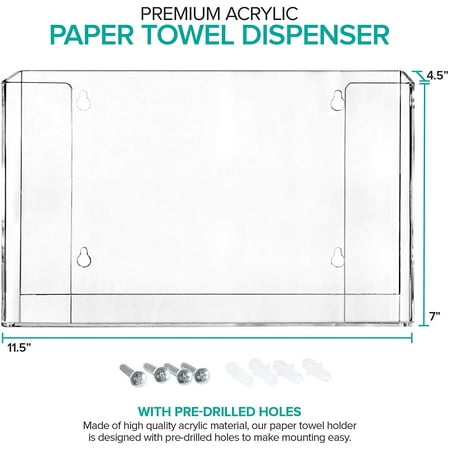 Premium Acrylic Paper Towel Dispenser: Made of high quality acrylic material, our paper towel holder is designed with pre-drilled holes to make mounting easy. Dimensions: 11 ½” Width x 7” Height x 4 ½” Depth