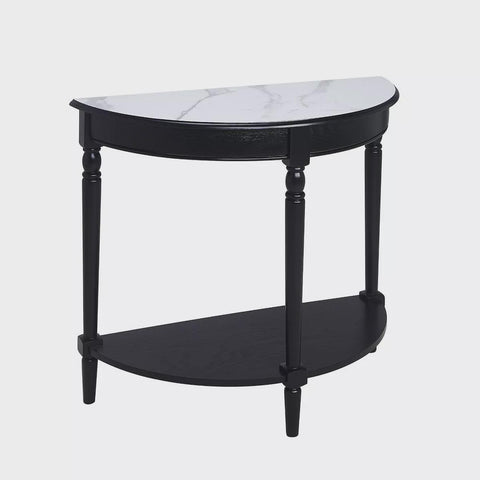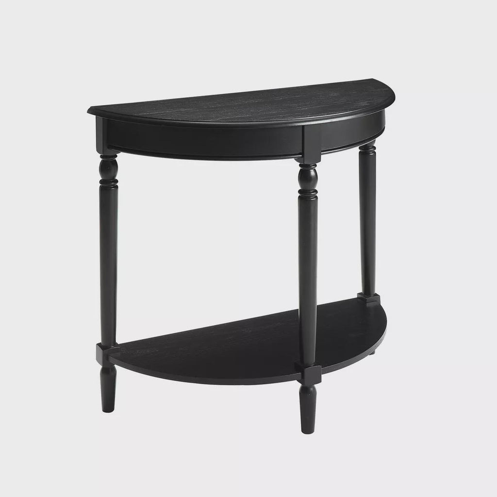 Features: Half Moon (shape)Number of Pieces: 1Dimensions (Overall): 30 Inches (H) x 31.5 Inches (W) x 14 Inches (D)Weight: 14 PoundsMaterial: Hardwood (Frame)Tabletop Material: Wood VeneerFeatures: Turned Legs, Fixed Shelf/ShelvesAssembly Details: Adult Assembly Required, Tools ProvidedCompartment 1 Type: ShelfFrame Color: BlackTabletop Thickness: 16 MillimeterCompartment 1 Quantity: 1Tabletop color: BlackTCIN: 14518586UPC: 095285212064Item Number (DPCI): 249-16-0779Origin: Imported249-16-0779