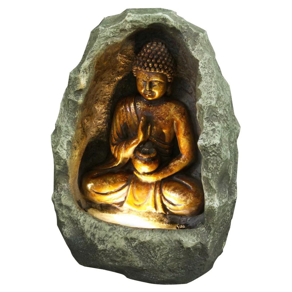 Golden Buddha Water Fountain This tranquil fountain showcases a golden buddha seated on the inside of a carved stone. Includes a light up feature. Made from durable polyresin. Ideal for indoor and outdoor use. Pump Included Warm Light Height: 14.75" Material: Polyresin Color: Grey stone, gold Buddha