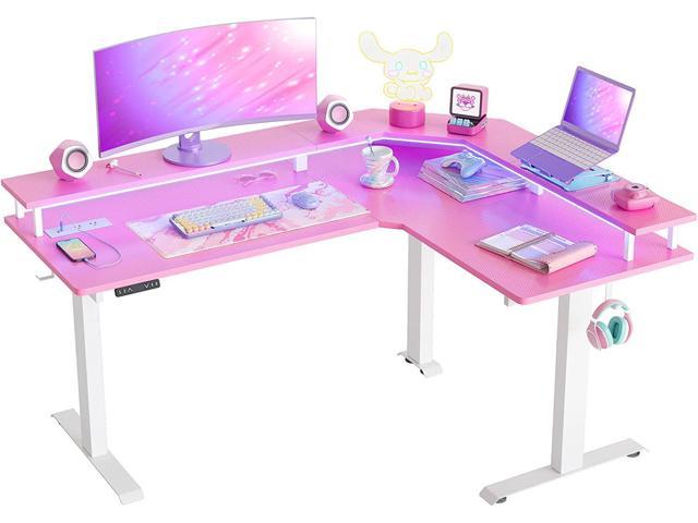 63" Triple Motor L Shaped Standing Desk with LED Strip & Power Outlets, Height Adjustable Stand up Corner Gaming Desk with Ergonomic Monitor Stand, Pink Carbon Fiber Top/White Frame