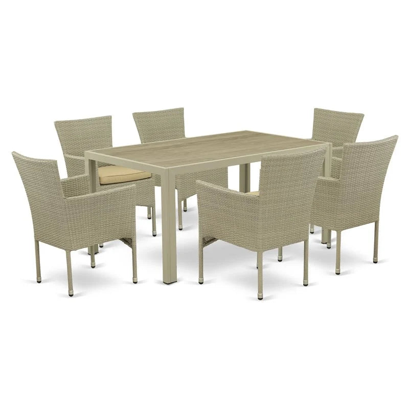 Furnish your patio dining area with this wicker patio set with a Natural finish. This 7 pc JUBK7-3A Outdoor-Furniture set includes an acacia wood top Outdoor-Furniture table and 6 single arm chairs. Constructed from a lightweight steel frame and wrapped with woven resin wicker fiber, this solid foundation weather-resistant Outdoor-Furniture set functional uses, and maximum comfortability. The all-weather table with acacia wood table top brings a sophisticated look and allows you to place snacks, drinks or decorative items. The matching armchairs with cushions are designed to provide a comfortable and relaxing lounging experience in the Outdoor-Furniture area for hours at a time. The comfortable cushions are water-resistant, dustproof, easy to clean and built to last. Either it's an intimate gathering or a charming family dinner, this contemporary dining set delivers a great dining time experience in the fresh air with your family or friends.