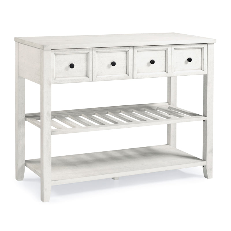 Rack up design points with this transitional style solid wood buffet. With an array of shelving options and two drawers that look like four, you can display or hideaway holiday dishes, cookbooks, or any other sort of item. The slotted middle shelf is ideal for storing wine bottles. This open and closed storage console also makes a great sofa table and will take your coastal, farmhouse, or transitional design a step beyond what you imagined was possible.