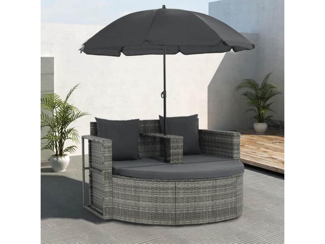 2 Seater Patio Sofa with Cushions and Parasol Gray Poly Rattan Day Bed