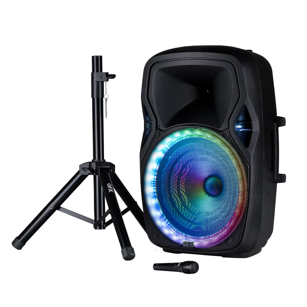 - 15” BLUETOOTH RECHARGEABLE SPEAKER: Includes a speaker stand, microphone, and a remote control.