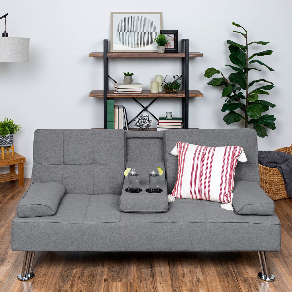 Modern Linen Convertible Futon Sofa Bed w/ Removable Armrests, Metal Legs, 2 Cupholders - Gray