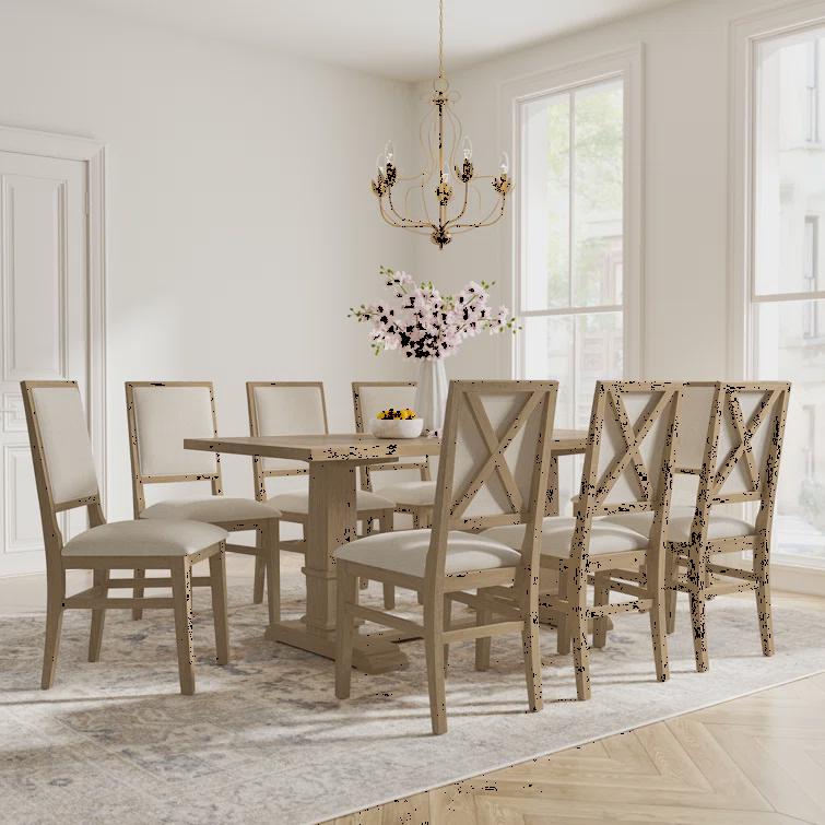 This 9-piece dining table set instantly creates a laid-back, elegant vibe in your space. Crafted from solid and engineered wood with a light brown finish, a large rectangular trestle table pairs beautifully with the eight upholstered dining chairs, offering seating for casual dinners and special occasions. Each side chair features a classic design with a cross detail on the back. Cream-toned linen fabric on the seat and back complete the look. Balancing the table’s square-columned trestle base is a spacious top, making this set the ideal spot for your next big dinner party. Hand-curated by Kelly Clarkson.